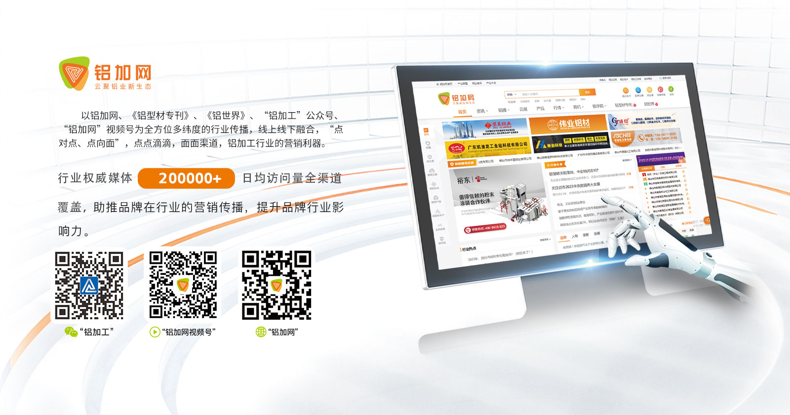 鋁加網(wǎng)(www.albiz.cn)是聞名鋁加工行業(yè)的垂直門戶網(wǎng)站,云聚鋁業(yè)新生態(tài),構(gòu)建鋁業(yè)新場景,以albiz.cn 網(wǎng)站為核心,以移動(dòng)云端、鋁加工微信、鋁加網(wǎng)視頻號(hào)、《鋁型材專刊》和《鋁世界》雜志為載體,成為了鋁加工行業(yè)資訊和精準(zhǔn)傳播的首選傳媒。鋁加網(wǎng),采集和發(fā)布全行業(yè)信息資訊,提供線上展覽、在線直播、短視頻、品牌策劃、品牌運(yùn)營、品牌傳播等全方位的專業(yè)服務(wù)。